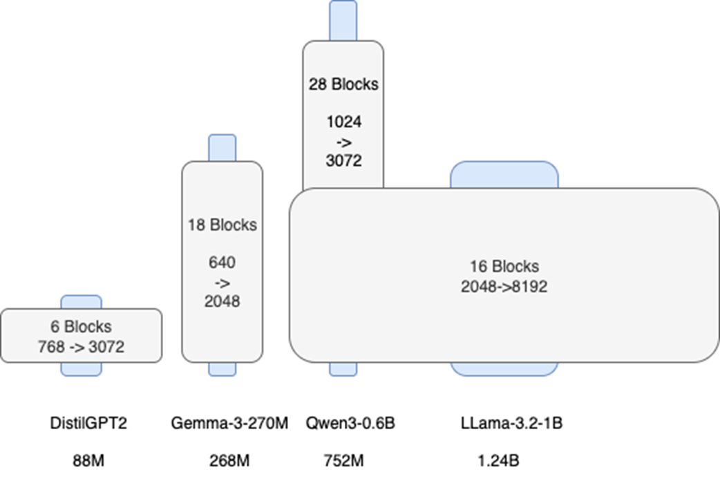Modèles profonds et étroits : En contraste, les modèles comme Qwen3-0.6B et Gemma-3-270M, avec un embedding plus petit et une expansion x3, sont plus profonds et plus étroits. Ils priorisent un nombre plus élevé de transformations séquentielles.